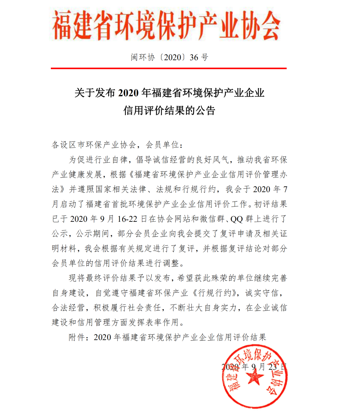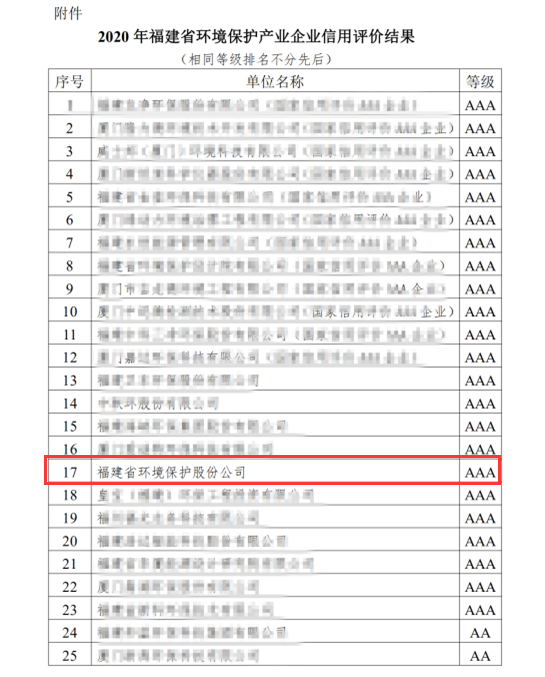 9月23日,2020年福建省環(huán)境保護產(chǎn)業(yè)企業(yè)信用評價結(jié)果公布,福建省環(huán)境保護股份公司在企業(yè)整體水平、財務(wù)狀況、管理水平、技術(shù)能力和信用情況等考量指標體系中均表現(xiàn)優(yōu)異,被授予福建省環(huán)保產(chǎn)業(yè)企業(yè)信用評價等級最高級別AAA級。