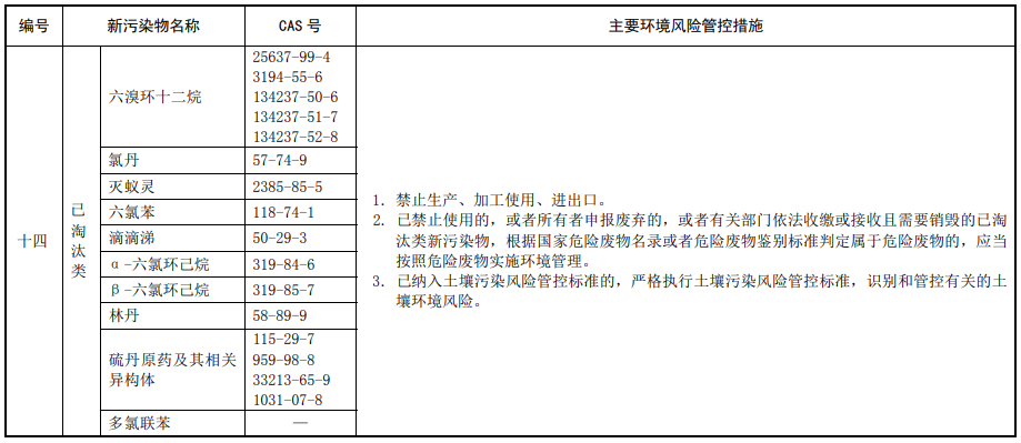 第三條 對列入本清單的新污染物,應(yīng)當按照國家有關(guān)規(guī)定采取禁止、限制、限排等環(huán)境風險管控措施。