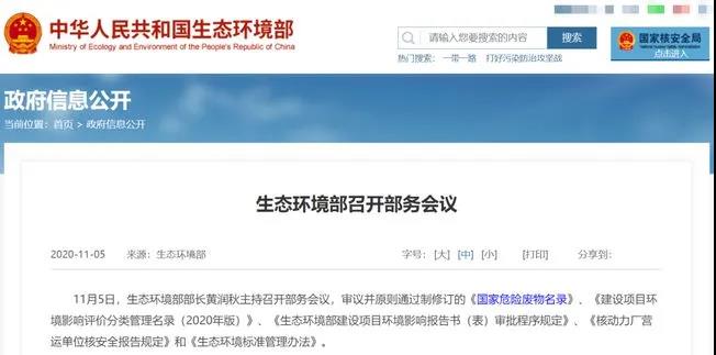 11月5日,生態(tài)環(huán)境部部長(zhǎng)黃潤(rùn)秋主持召開部務(wù)會(huì)議,審議并原則通過制修訂的《國(guó)家危險(xiǎn)廢物名錄》、《建設(shè)項(xiàng)目環(huán)境影響評(píng)價(jià)分類管理名錄(2020年版)》、《生態(tài)環(huán)境部建設(shè)項(xiàng)目環(huán)境影響報(bào)告書(表)審批程序規(guī)定》、《核動(dòng)力廠營(yíng)運(yùn)單位核安全報(bào)告規(guī)定》和《生態(tài)環(huán)境標(biāo)準(zhǔn)管理辦法》。
