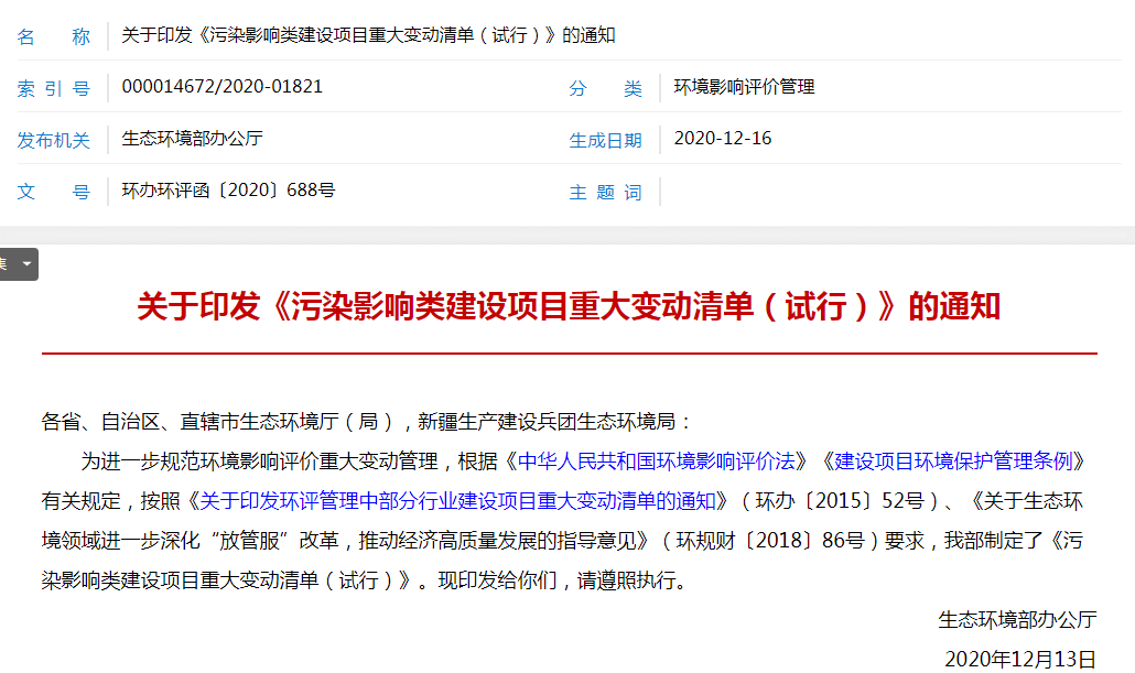 日前,生態(tài)環(huán)境部發(fā)布《污染影響類建設(shè)項目重大變動清單(試行)》,全文如下: