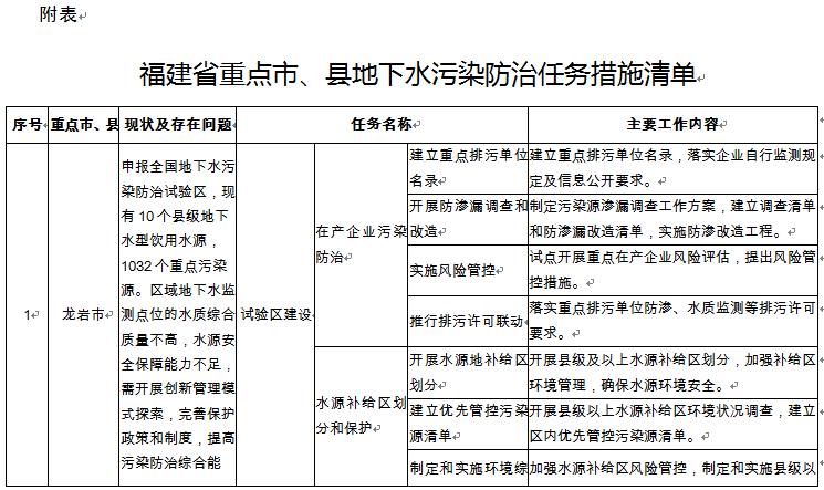 開展地下水污染防治分區(qū)管理。實(shí)施地下水環(huán)境分區(qū)管理、分級防治,明確環(huán)境準(zhǔn)入、隱患排查、風(fēng)險(xiǎn)管控等差別化環(huán)境管理要求。在三明尤溪開展地下水污染防治重點(diǎn)區(qū)劃定,在龍巖新羅和連城、三明大田開展地下水環(huán)境分區(qū)管理試點(diǎn)。2024年底前完成九市一區(qū)地下水污染防治重點(diǎn)區(qū)劃定工作。