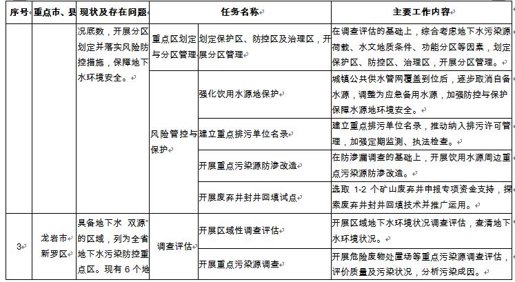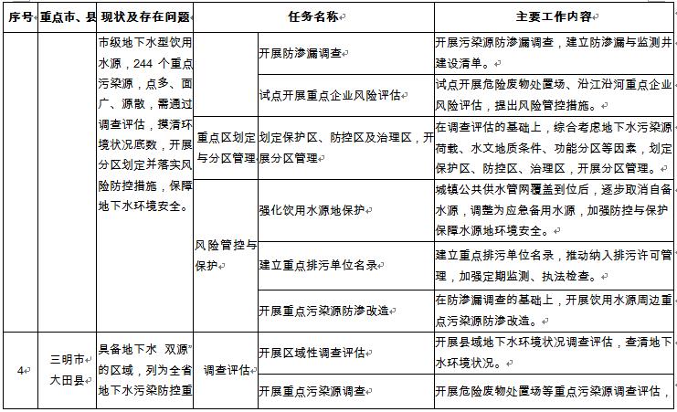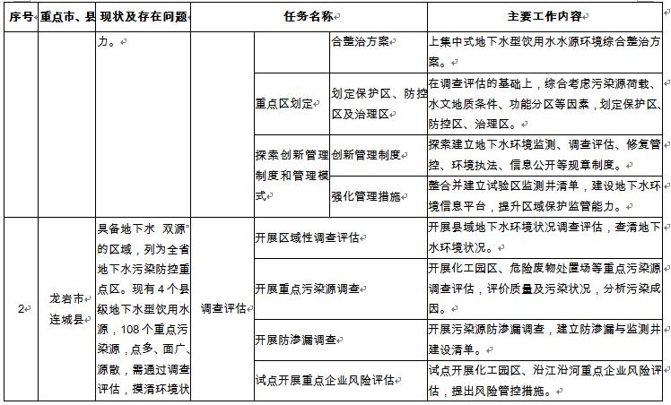 1.區(qū)域地下水環(huán)境狀況調(diào)查評估。在九市一區(qū)開展市級的地下水環(huán)境狀況調(diào)查評估,摸清區(qū)域地下水環(huán)境質(zhì)量狀況。 2.化工園區(qū)地下水環(huán)境狀況調(diào)查評估。以省級以上化工園區(qū)為重點(diǎn),開展全省化工園區(qū)地下水環(huán)境狀況調(diào)查評估。 3.非化工類重點(diǎn)排污單位地下水環(huán)境狀況調(diào)查及監(jiān)測。開展危險(xiǎn)廢物處置場、垃圾填埋場地下水環(huán)境狀況調(diào)查評估;開展上杭紫金山金銅礦等礦山開采區(qū)地下水環(huán)境狀況調(diào)查評估;地下水重點(diǎn)排污單位開展地下水環(huán)境狀況調(diào)查監(jiān)測。 |